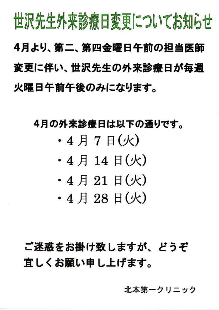 4月の世沢先生外来診療日はこちらです。